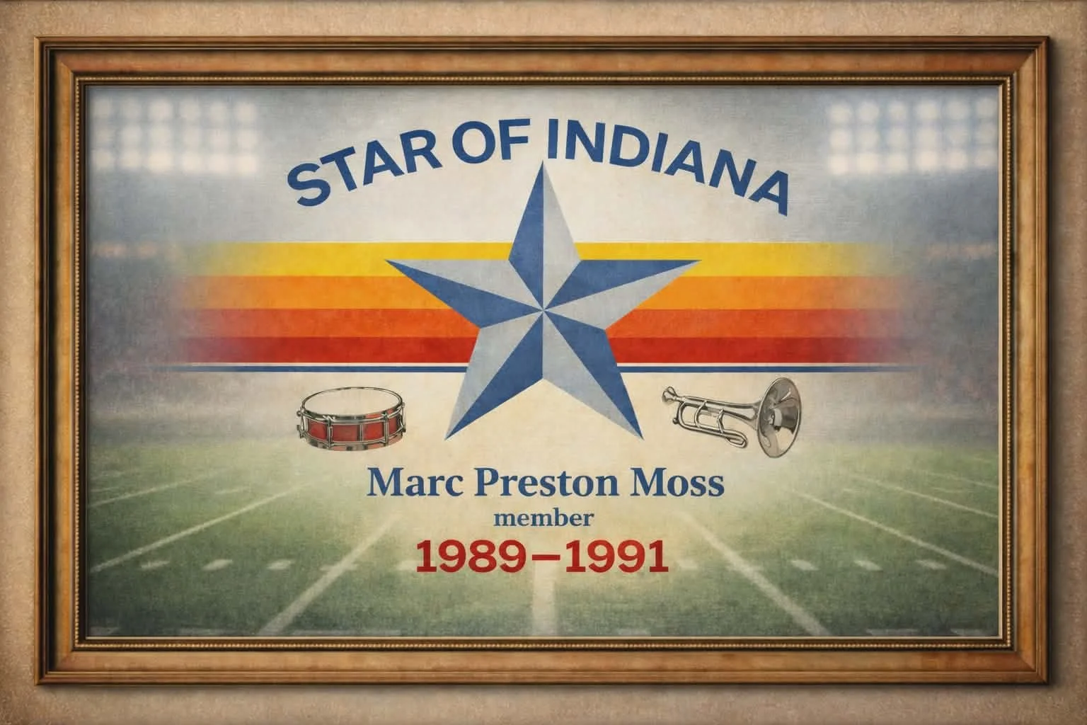Marc Preston Moss began his years in the marching arts in Greentown, Indiana at Eastern High School. After graduating in 1988, he joined the Star of Indiana Drum & Bugle Corps from Bloomington, Indiana and performed with them until he aged out in 1991, when Star won the coveted DCI World Championship. He was selected by the corps director to represent Star in the 1991 All-Star Drum & Bugle Corps, performing in the Macy's Thanksgiving Day Parade.